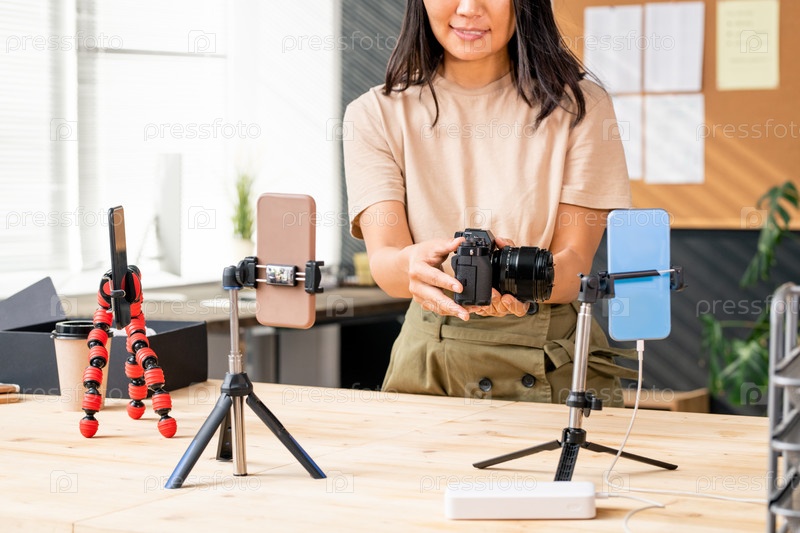 Азиатская женщина распаковывает его и записывает процесс на камеру смартфона