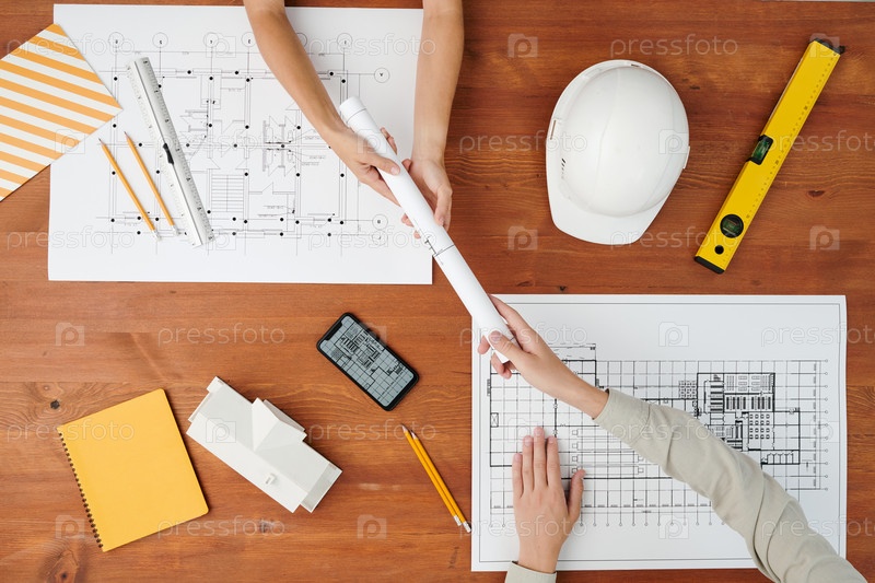 Плоская игра рук молодой архитектуры, передающая прокатный план коллеге