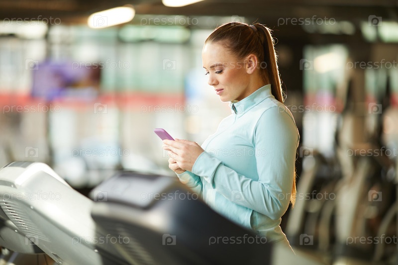 Женщина, использующая смартфон на Tradmill Woman