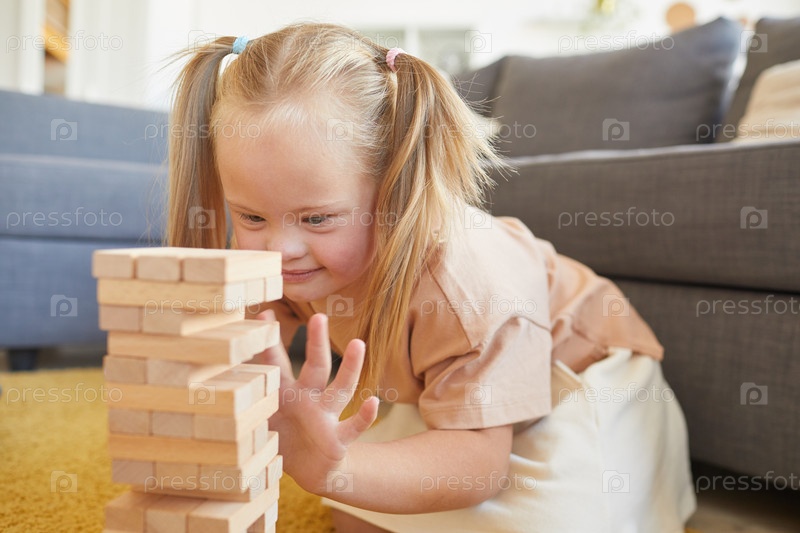 Милая девочка с синдромом Дауна играет в настольную игру