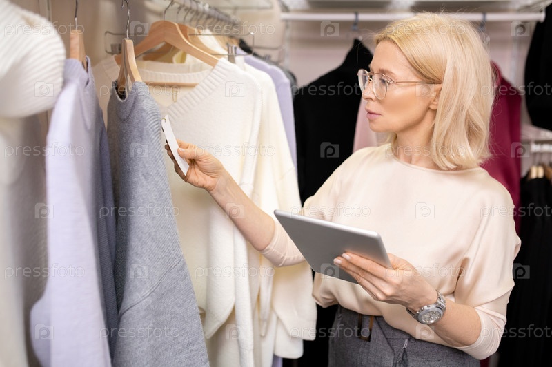 Блондинка-зрелая продавщица с цифровым планшетом, которая смотрит на ценовую табличку платья