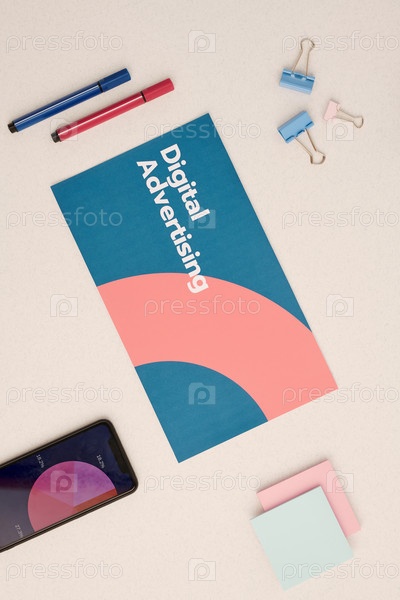 Плоский макет брошюры цифровой рекламы, окруженной канцелярскими принадлежностями