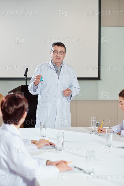 Зрелый ученый показывает вакцину от коронавируса