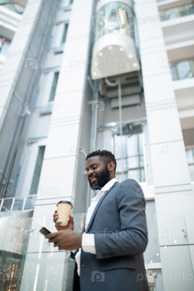 Улыбающийся молодой чернокожий бизнесмен проверяет смс