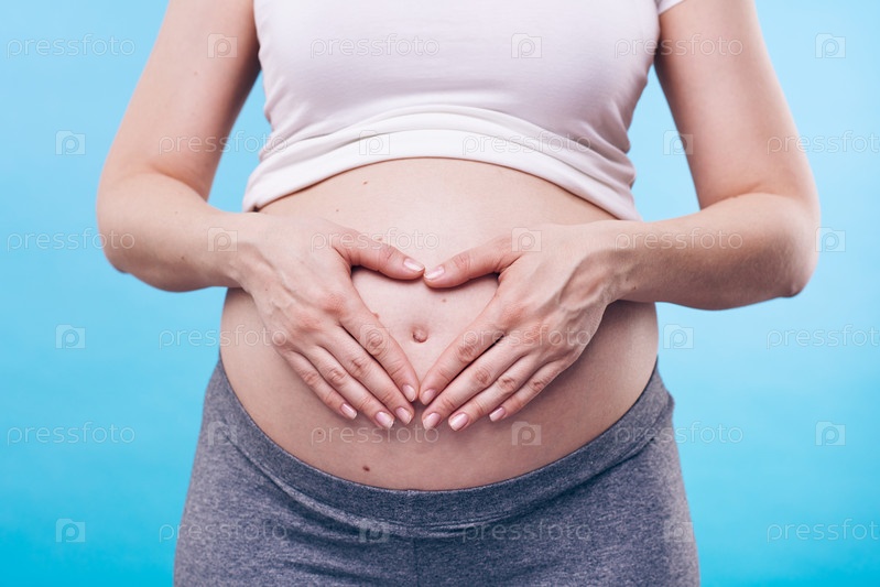 Молодая женщина делает форму сердца с руками на беременном животе