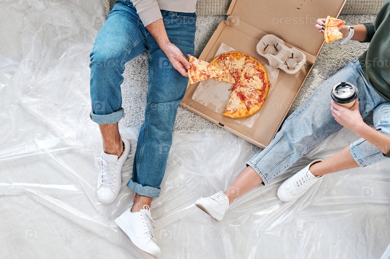 Обзор молодой пары в повседневной одежде, сидящей на полу и есть пиццу
