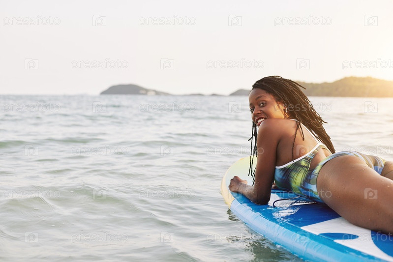 Чернокожая женщина плавает на доске для серфинга
