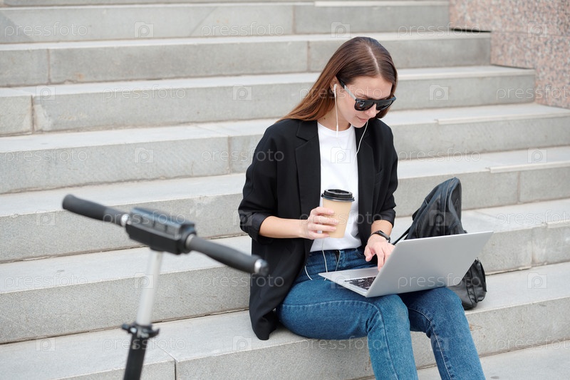 Девушка со стаканом кофе, смотрящая на дисплей ноутбука во время серфинга в сети