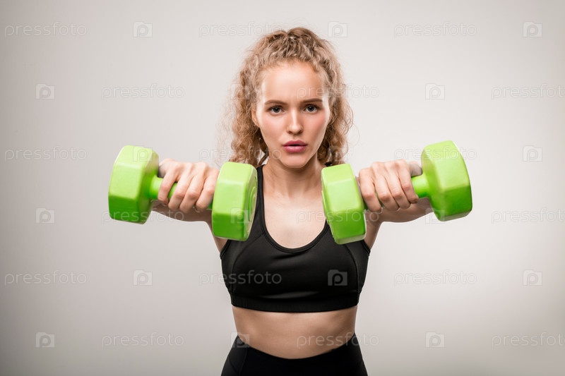 Молодая активная спортсменка в черном спортивном костюме занимается перед камерой