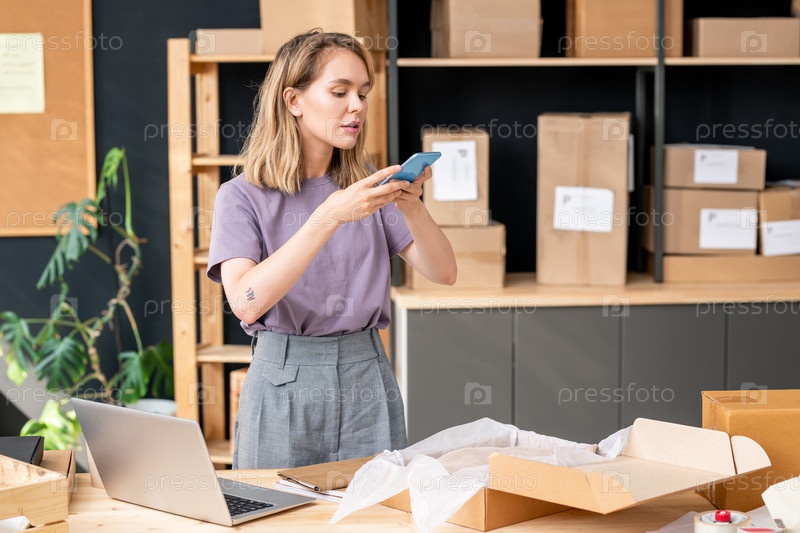 Молодая красивая женщина со смартфоном фотографирует сложенный свитер в коробке