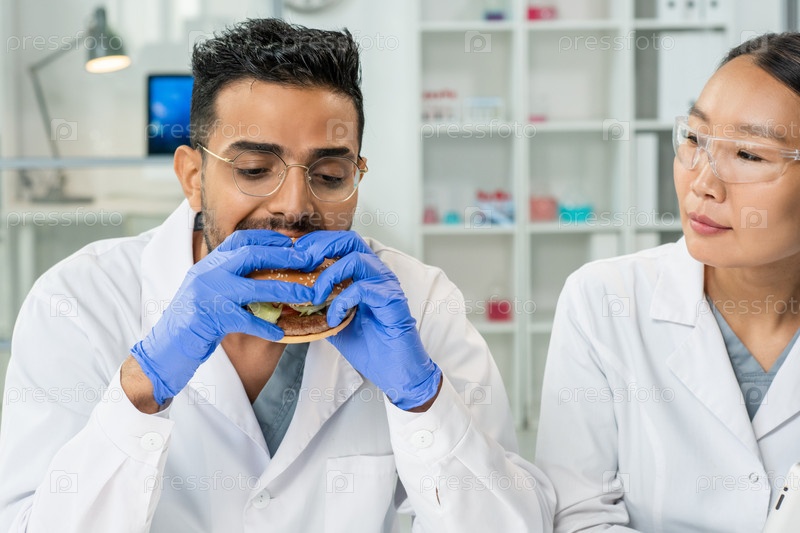В перчатках молодой мужской работник управления пищевыми продуктами, ест гамбургер по месту работы
