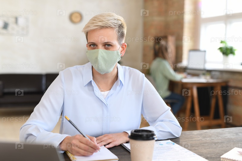 Портрет молодой блондинки в тканевой маске, сидящей за столом с отчетной бумагой и делающей записи во время работы в офисе