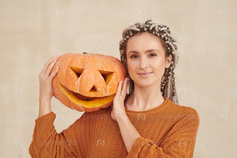 Портрет улыбающейся хипстерской молодой женщины с белыми дрейдами, позирующей с фонариком на плече на изолированном фоне, концепция Хэллоуина