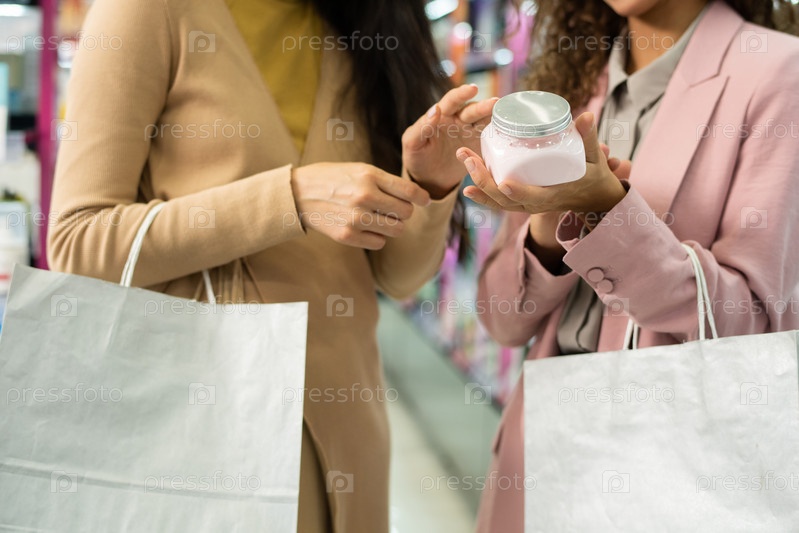 Руки двух молодых женщин-покупательниц с бумажными пакетами, выбирающих крем для тела