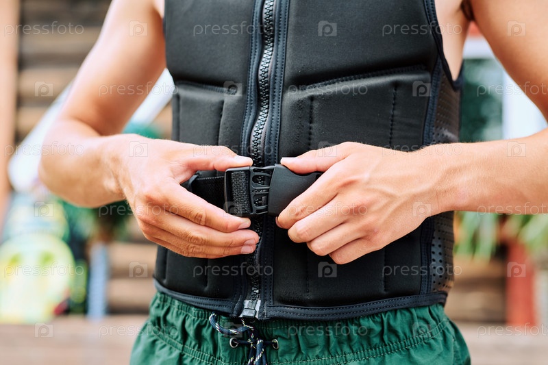 Руки молодого активного мужчины, пристегивающего ремень безопасности на черной куртке перед серфингом