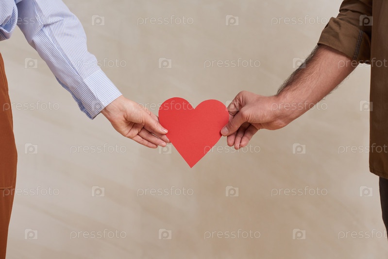 Непризнанный молодой мужчина и женщина стоят вместе, держа красное бумажное сердце, концепция дня святого Валентина