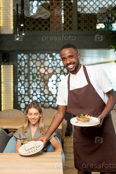 Улыбающаяся вода смотрит в камеру, одновременно кладя тарелку с десертом на стол