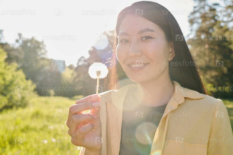 Счастливая молодая азиатская брюнетка-женщина с зубчатой улыбкой, держащая одуванчик
