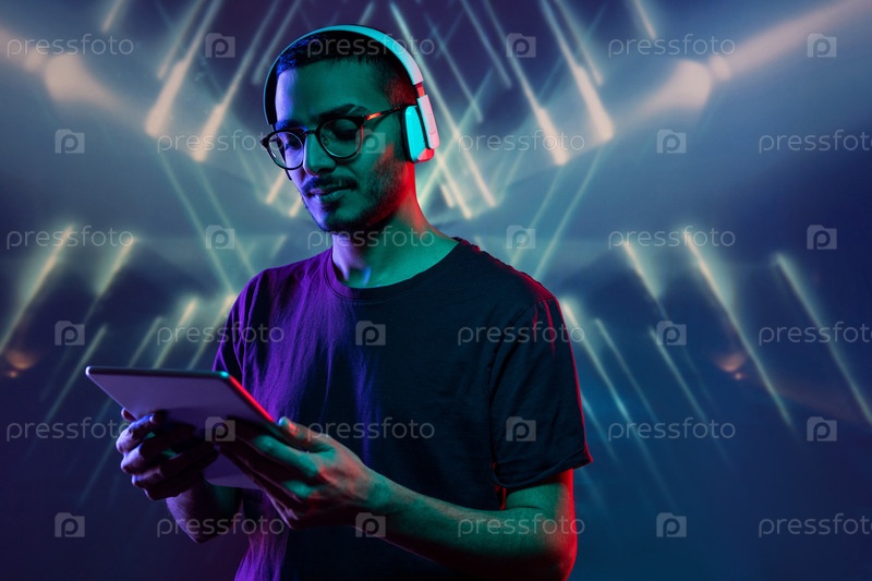 Молодой человек с наушниками и цифровым планшетом перед собой смотрит видео