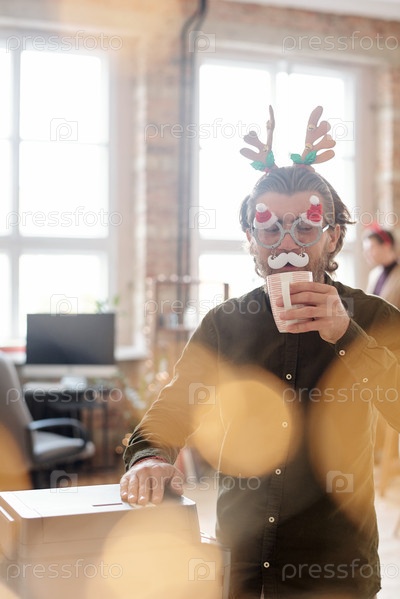 Бородатый бизнесмен в рождественских очках с белыми усами пьет кофе