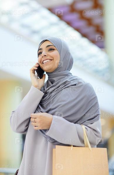 Улыбающаяся ближневосточная женщина говорит со смартфона