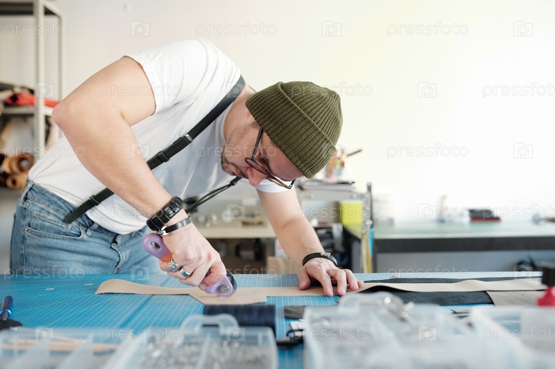 Молодой ремесленник наклоняется над столом, отрезая кусок бежевого дома или кожи