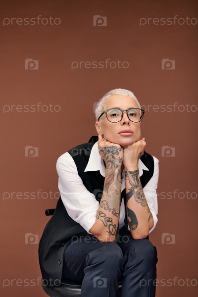 Молодая блондинка с короткими волосами и руками, покрытыми татуировками сидит на стуле