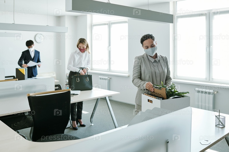 Молодые бизнесмены в формальной одежде и защитных масках вывозят припасы