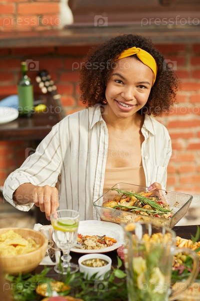 Молодая афроамериканка наслаждается ужином на улице летом