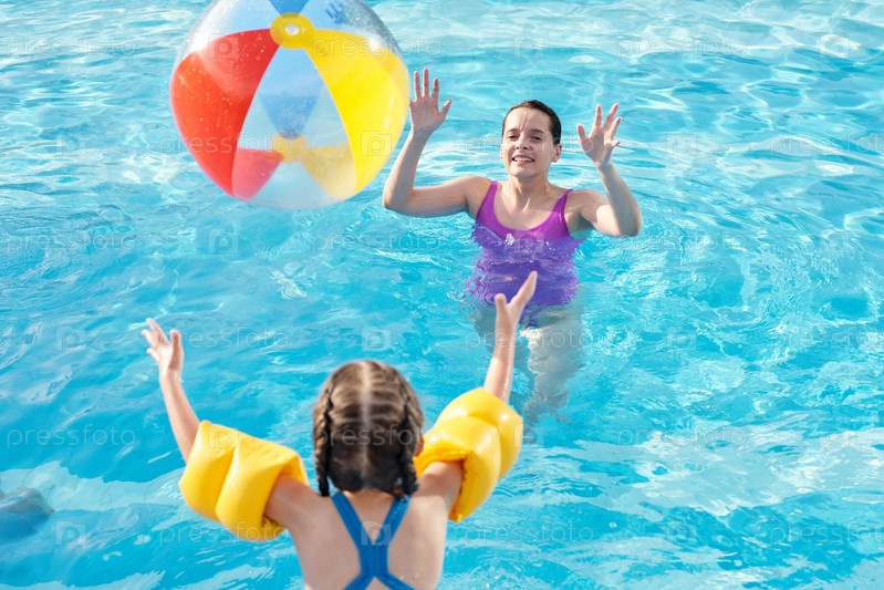 Молодая мать играет в мяч со своей милой маленькой дочерью в прозрачной воде