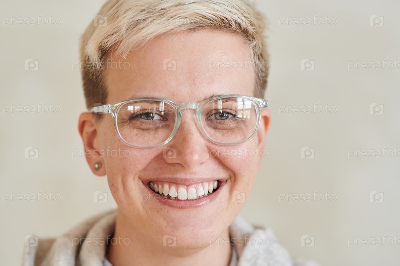 Портрет положительно привлекательной девушки-томбоя с короткими светлыми волосами, носящей очки на изолированном фоне