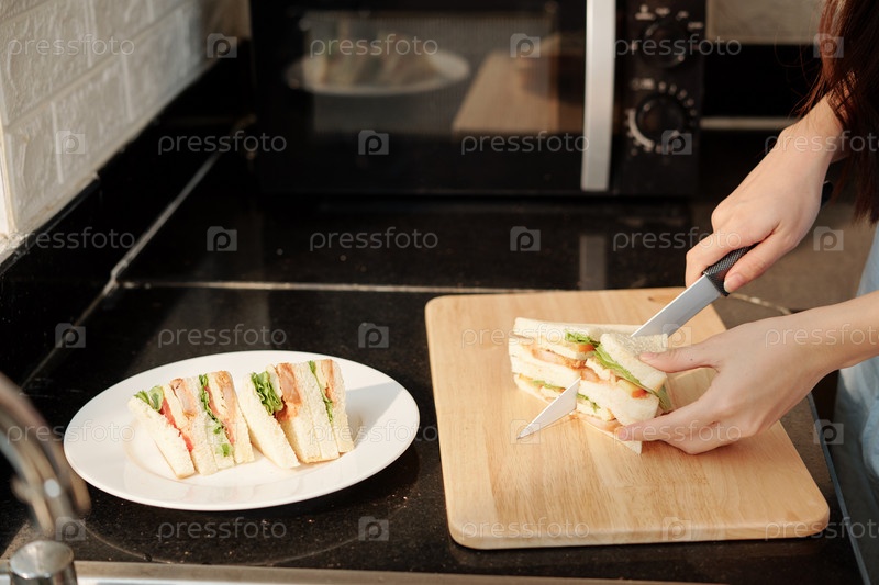 Домашняя хозяйка режет куриный сэндвич