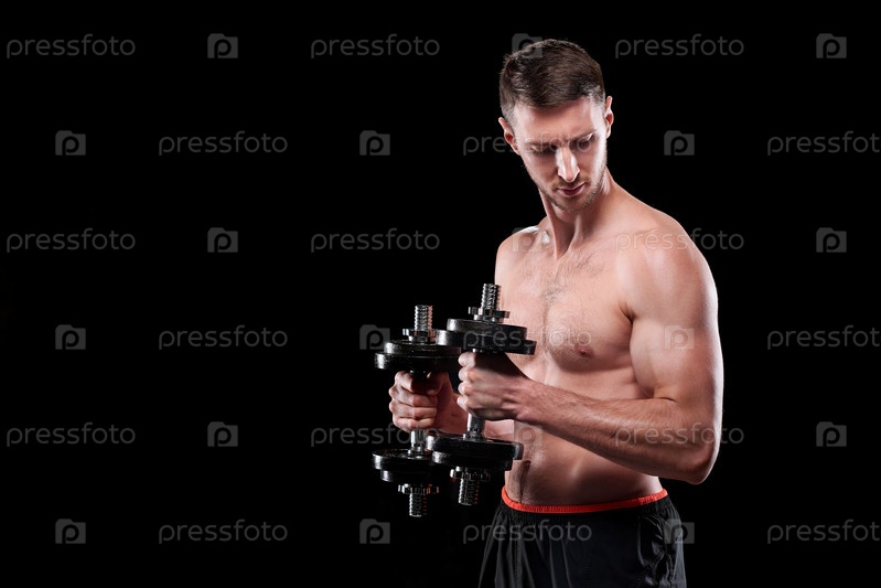 Молодой мускулистый бодибилдер с штангами делает сложные упражнения для бицепса