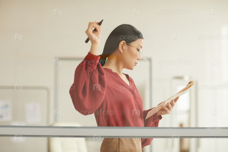 Азиатская бизнесвумен, пишущая на стеклянной стене