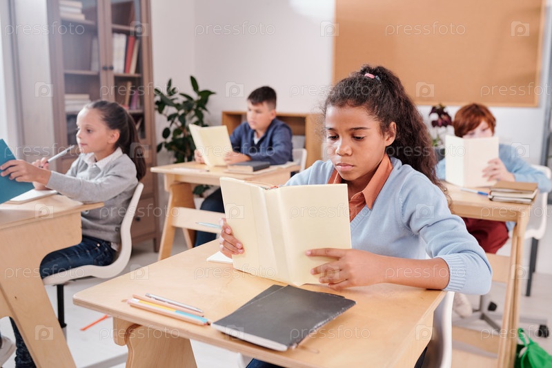 Школьница смешанной расы и группа ее одноклассников у других столов читают книги