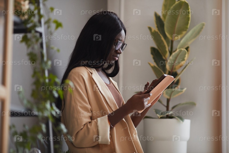 Афроамериканская бизнесвумен в офисе Современный боковой вид