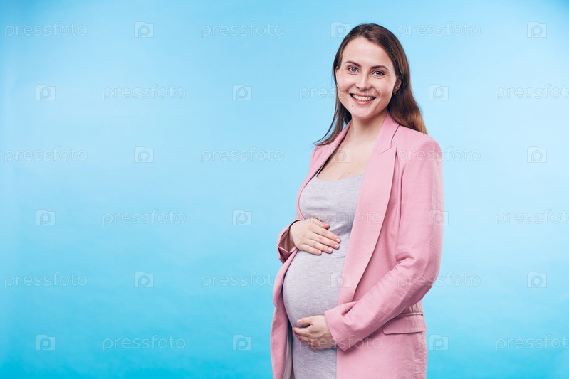 Счастливая молодая элегантная будущая мама в сером повседневном платье и розовом траншкоте