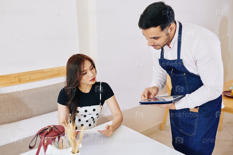 Официант записывает заказ женщины