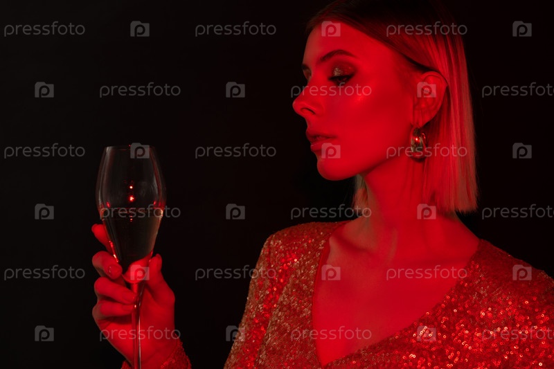 Молодая красивая женщина смотрит на флейту шампанского, делая тост
