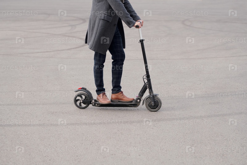 Молодой современный бизнесмен в пальто, штанах и сапогах стоит на электрическом скутере