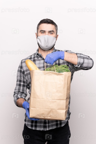 Мужской курьер в защитной маске и перчатках доставляет свежие продукты питания к вам