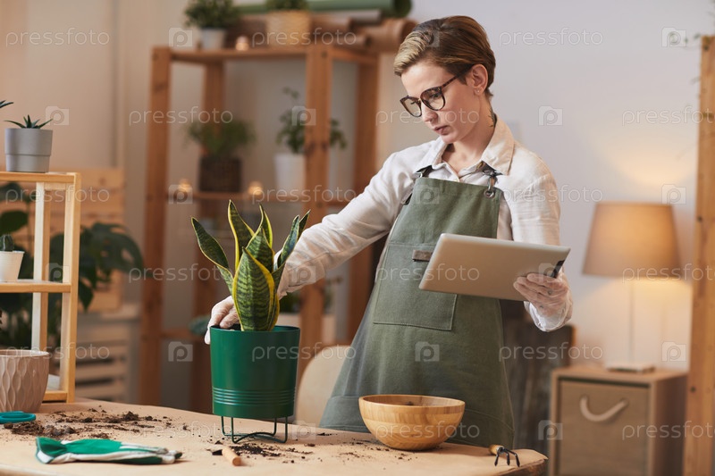 Молодая женщина смотрит на современные уроки садоводства