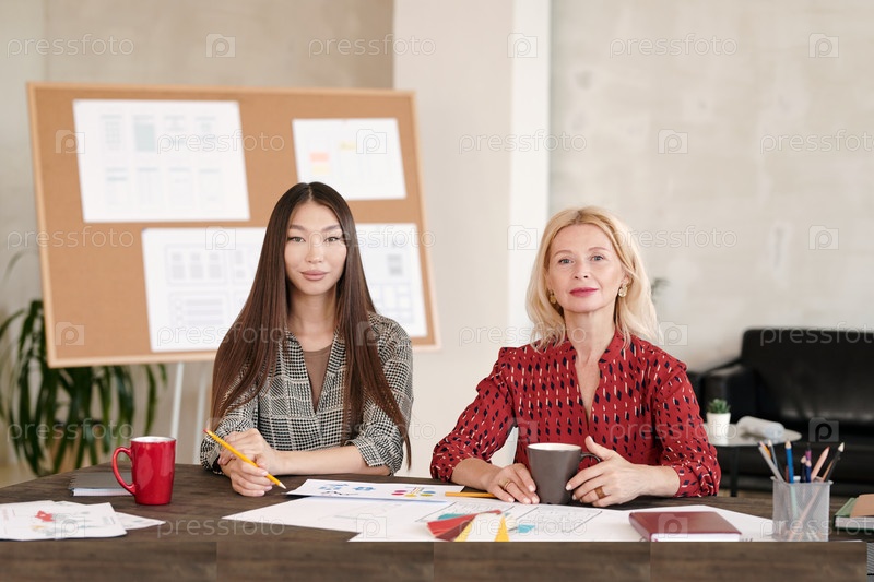 Две уверенные в себе современные бизнес-женщины в умной повседневной одежде, выпивая