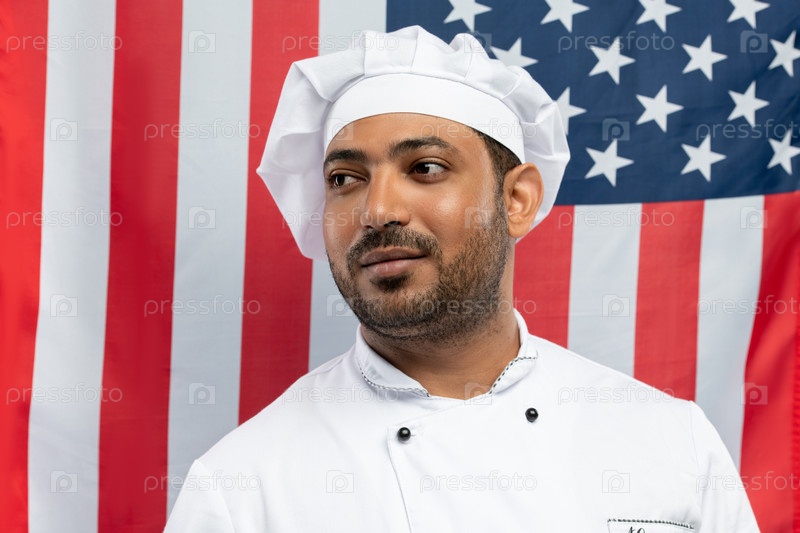 Молодой профессиональный шеф-повар в белой шляпе и пальто стоит напротив американского флага