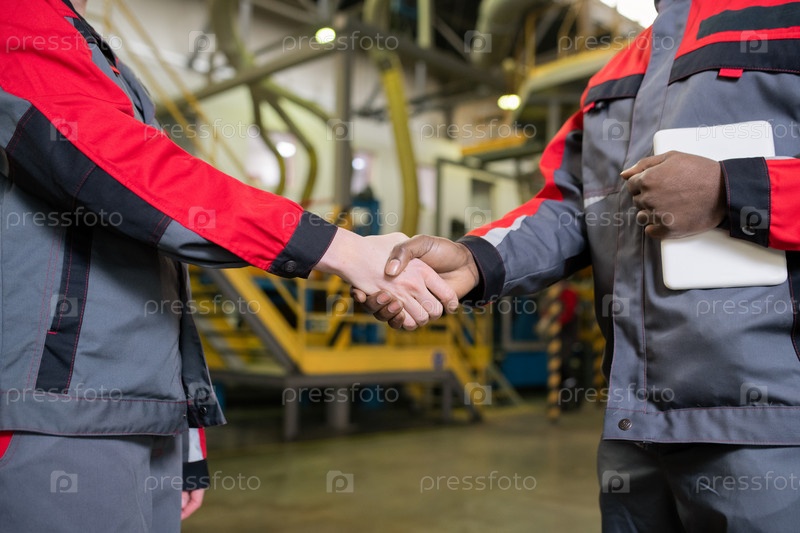 Начальники рукопожатия в фабричном магазине