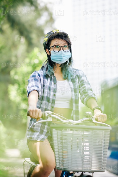 Молодая женщина едет на велосипеде