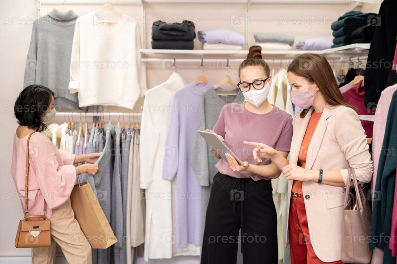 Молодой покупатель в защитной маске, указывающий на дисплей планшета во время объяснения