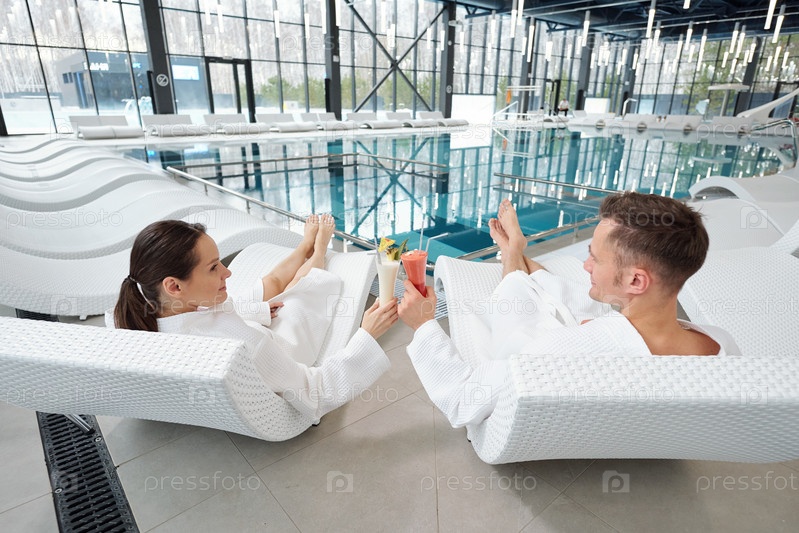Задний вид молодой отдыхающей пары в халатах, сидящей на креслах у бассейна