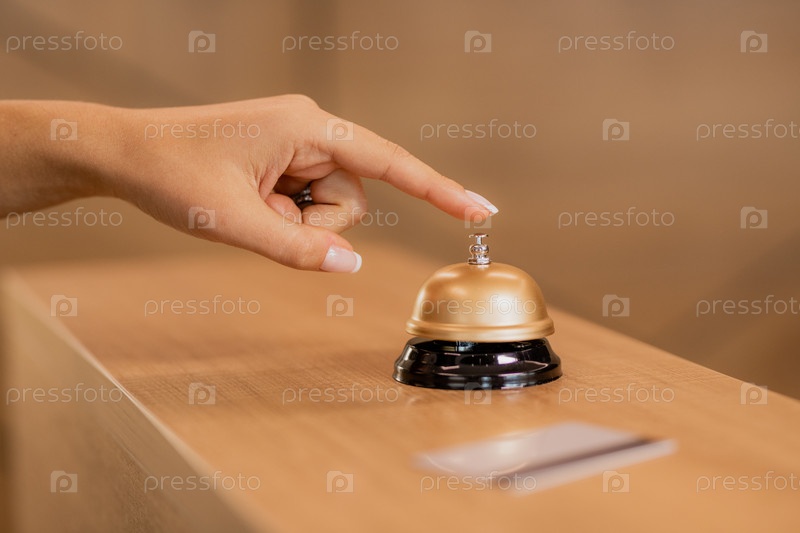 Рука молодой современной бизнес-женщины с помощью звонкового кольца на стойке приема
