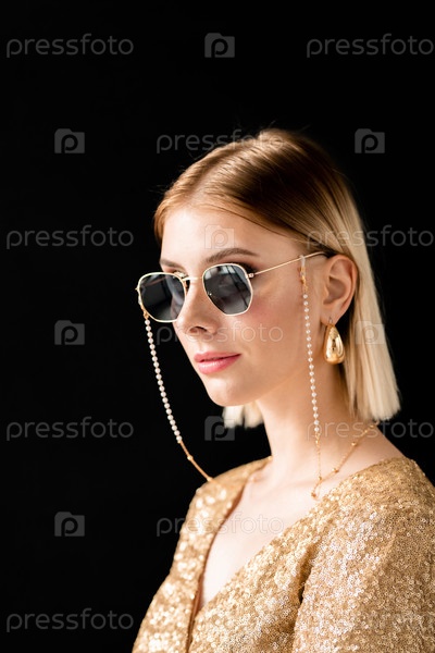 Красивая блондинка в гламурных солнцезащитных очках, элегантное платье и золотые серьги